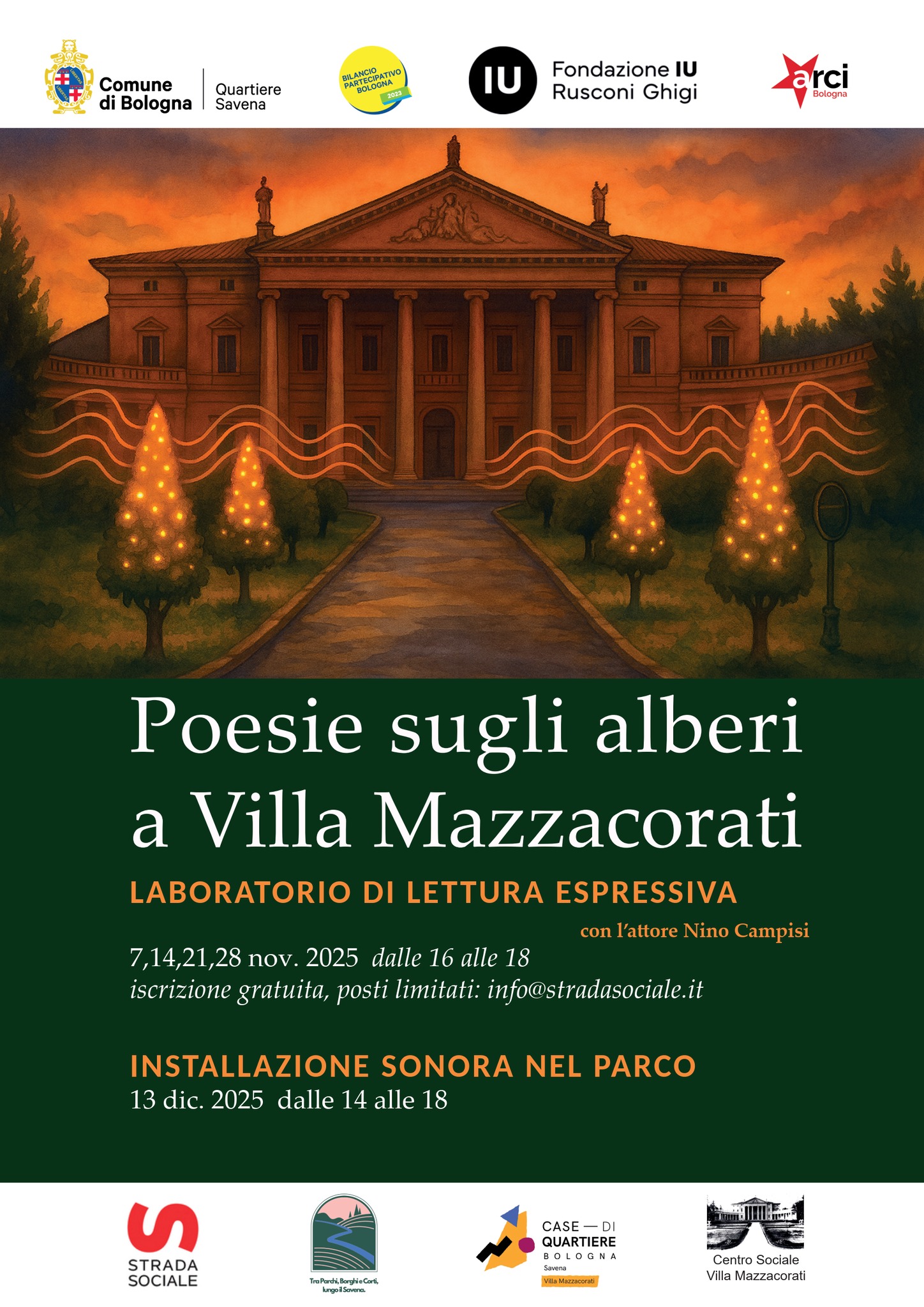 Sabato 13 dicembre 2025, dalle 14 alle 18, al Parco di Villa Mazzacorati sarà attiva un’installazione sonora con letture di poesie dedicate agli alberi. I versi risuoneranno tra i rami, creando echi tra poesia, natura e comunità.